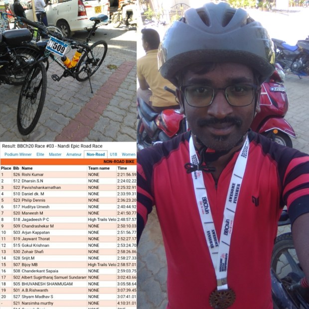 After Celebration Run, decided to participate in Epic Nandi Race, a cycling event organized by BBCh. Distance of the race was 60km but climbing Nandi hill with elevation of 500m after cycling 52km was a real challenge. However successfully finished the race with just 5 mins to spare, and secured 9th place in Hybrid Bicycle category.