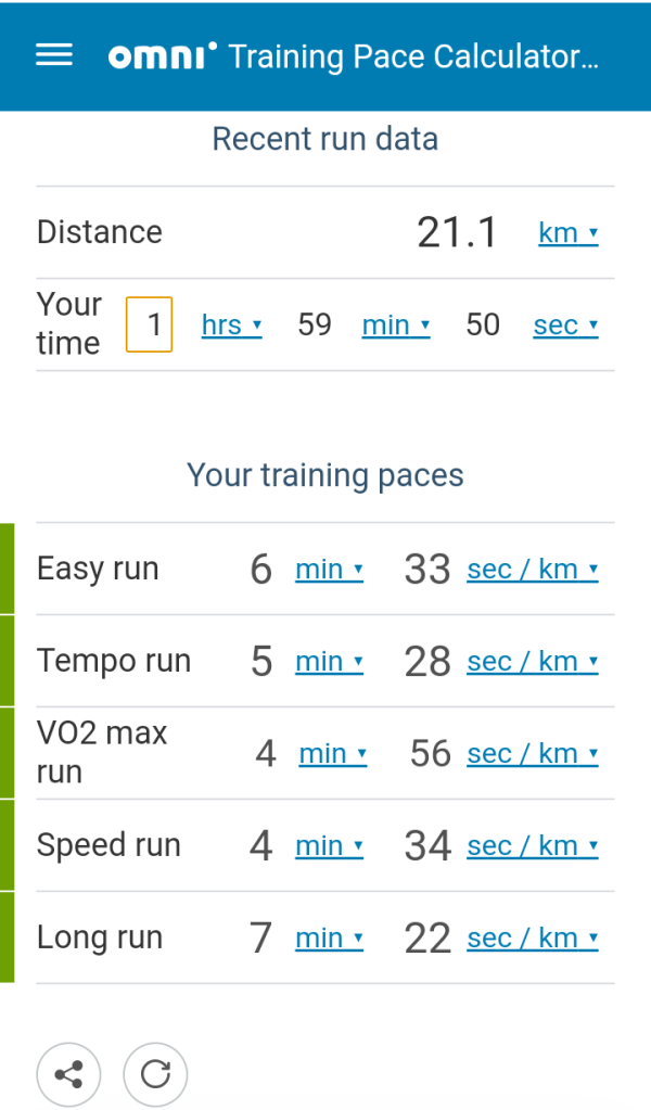 All terminologies are good but what exactly is a long run? what should be the pace for tempo run and easy runs? I was not sure, then I found this very useful running pace calculator from Omni calculator. Now I suppose to decide the time in which I wanted to complete the 21km run. Until now my average pace was 6:30, that accounts to 2hr 18 mins, but I thought to push myself and decided to run 21km in sub 2 hours. Entering this timing in calculator gave me idea of what pace I should be running on specific runs.